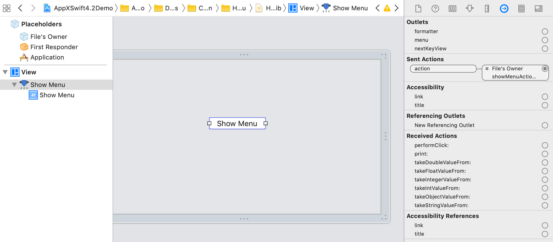 - Select your xib interface, Drag a button into the view, and change button title to "Show Menu".